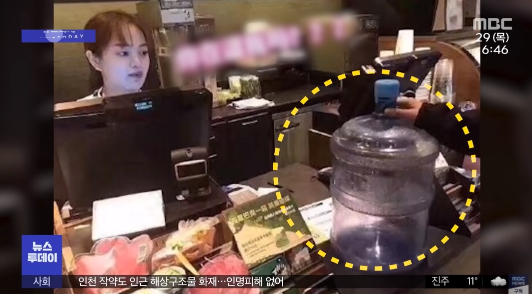 정수기 물통과 같은 대용량의 컵(?)을 가지고 온 모습이 보입니다.