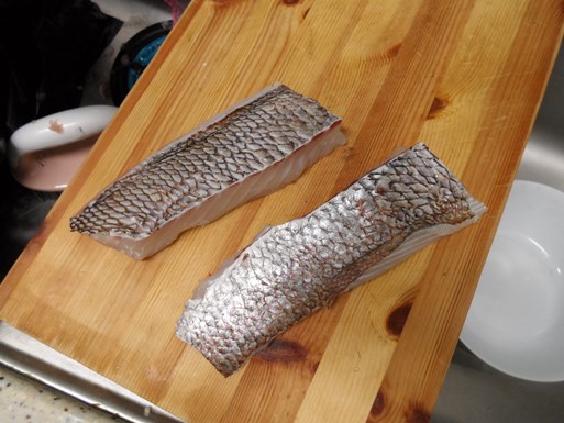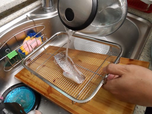 참돔류의 생선은 껍질채 손질한 후, 뜨거운 물을 부어