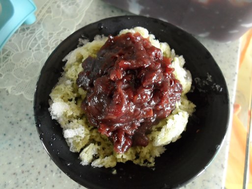 빙수얼음 위에 조금씩 골고루 뿌려줍니다.