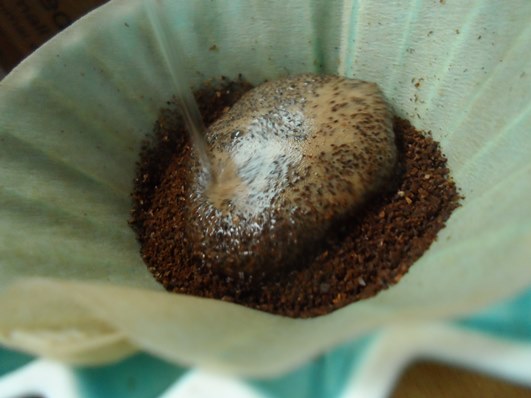원두에 뜨거운 물을 붓자 잘 부풀어오르기 시작합니다.