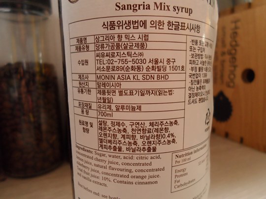 병에는 샹그리아 향 믹스시럽에 대한 내용이 적혀있는데,