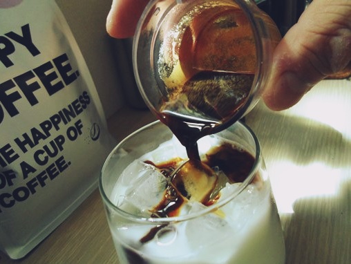 추출된 에스프레소를 얼음 가득 담긴 우유에 천천히 조심히 부어줍니다.