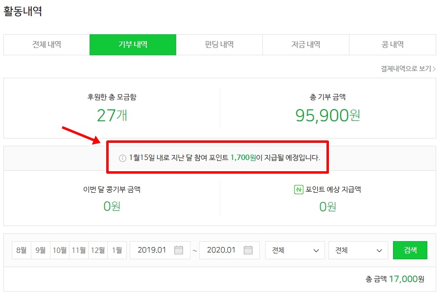 1,700원의 네이버 포인트를 이달 15일내로 지급받을 예정입니다.