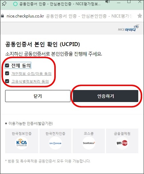 체크란에 체크하고, 인증하기를 눌러 공동인증서로 인증해 줍니다.