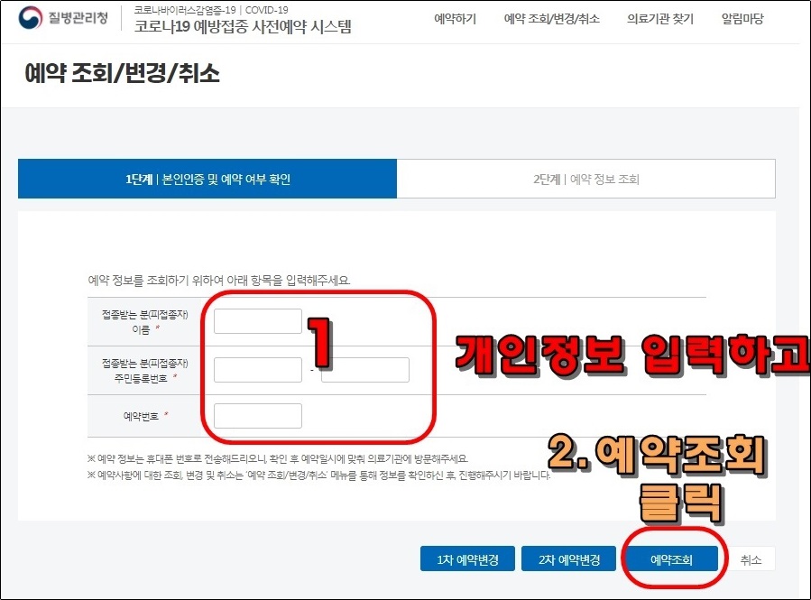 예약번호는 1차백신접종 예약을 할때에 선택한 방법으로