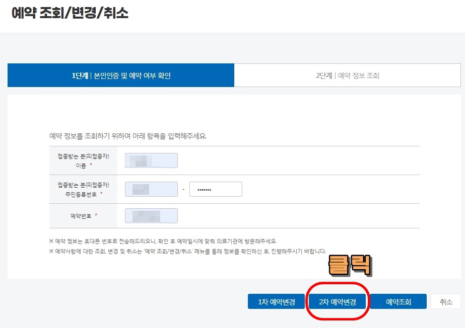 아래 노란박스의 '2차예약 변경'을 클릭해줍니다.