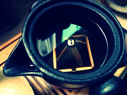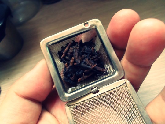 걸름망에 보이차를 넣어준 후, 포트에 넣고, 뜨거운 물을 부어줍니다.