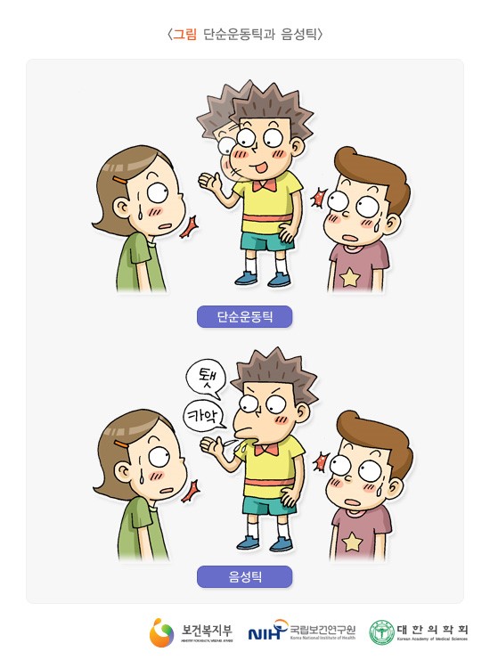 '틱'이라고도 하며 스스로 조절하기 힘든 갑작스럽고 단순하며 반복적인 동작(운동틱)이나