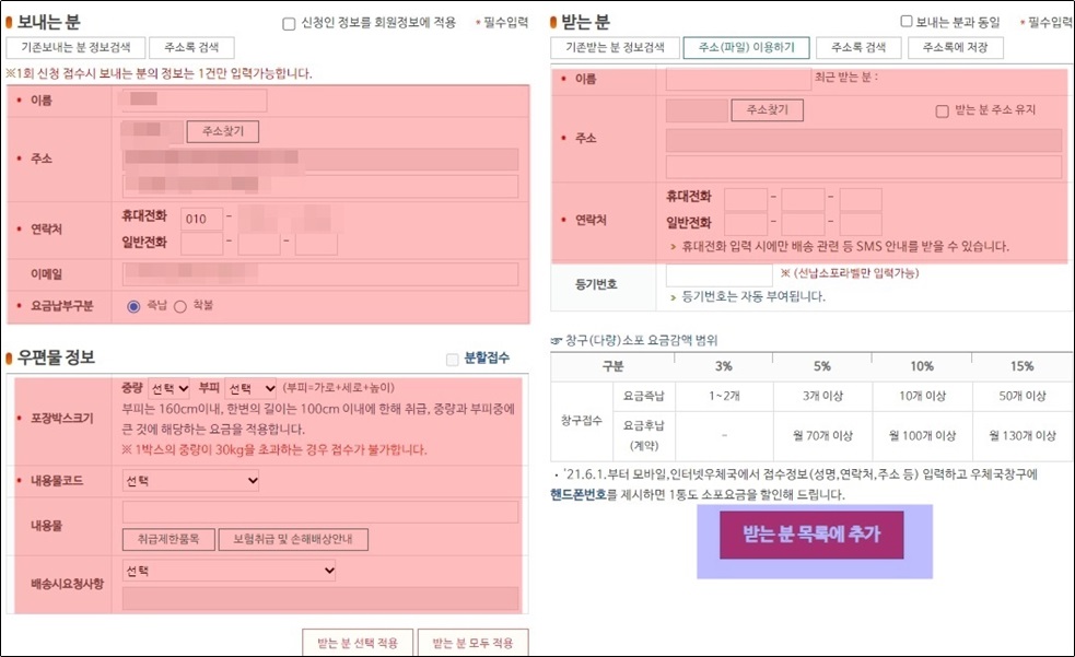보내는 분, 받는분, 우편물 정보를 작성합니다.