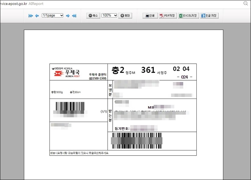 수취인 주소와 바코드가 함께 인쇄되는 것을 선택해 출력해주시면 됩니다.