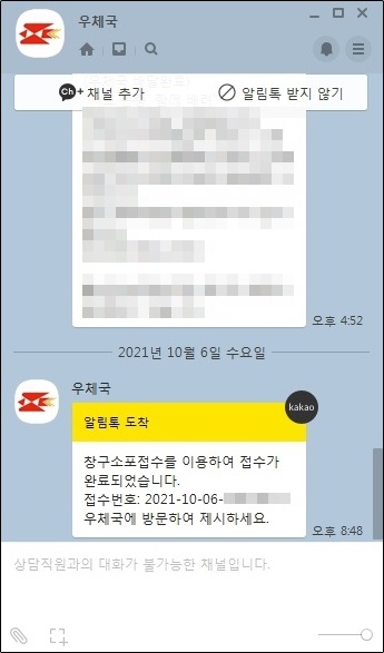 카톡으로 창구소포접수가 되었다는 문자가 옵니다.