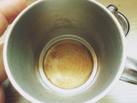 이제 분쇄된 원두를 베트남핀에 붓고, 연유를 넣은 머그잔 위에 올려놓습니다.