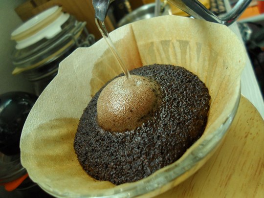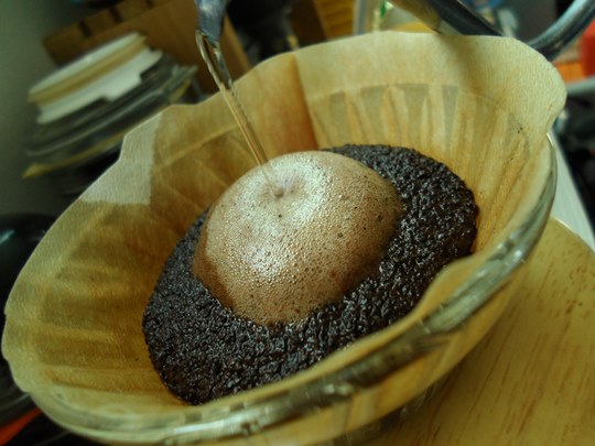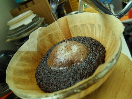 물줄기를 아주 얇게 만든 상태로 원두 가운데를 중심으로 부어줍니다.