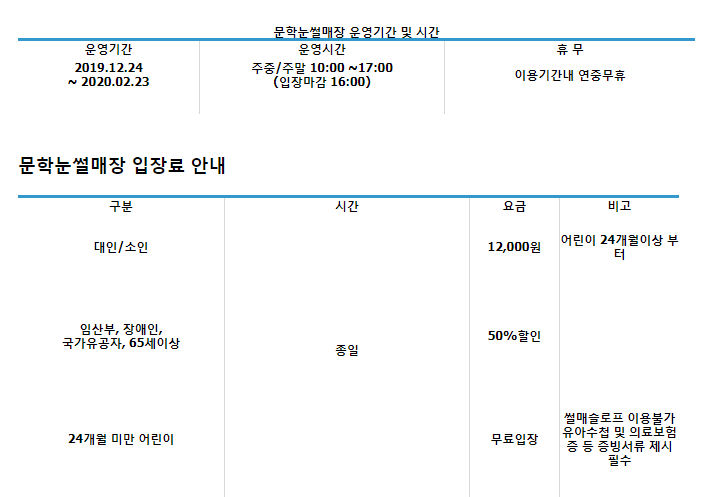아래에 눈썰매장 운영기간과 시간을 올립니다.