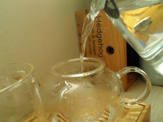 이제 티포트에 뜨거운 물을 가득채워 우롱차를 우려냅니다.