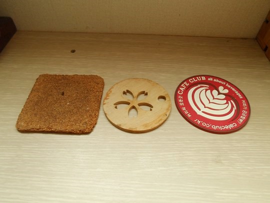 왼쪽부터 코르크 재질, 나무 재질, 실리콘 재질의 코스터 입니다.
