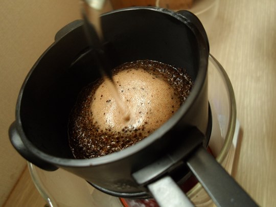 물을 부어 커피원두가 부풀어 오르면 물주기를 멈추고,