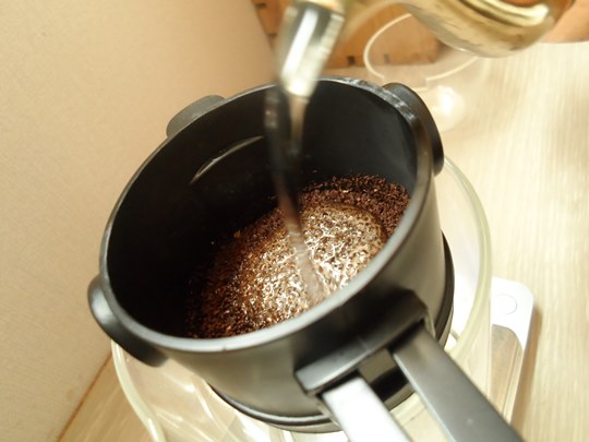 뜨거운 물을 원두 전체가 젖을 정도로만 조금 부어주고,