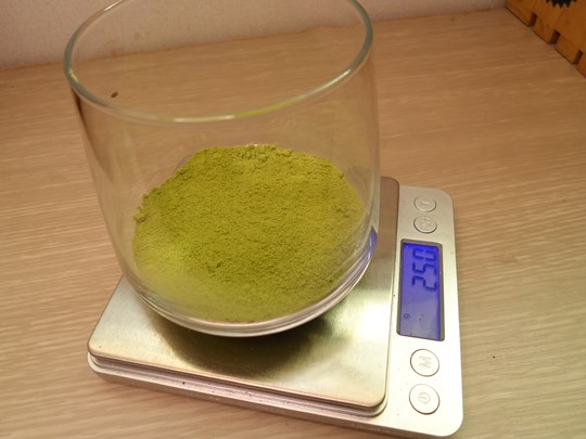 유리컵에 말차파우더 25g을 계량해 넣고,