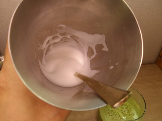 남은 우유로는 핸드블렌더로 고운 우유거품을 만든 후,