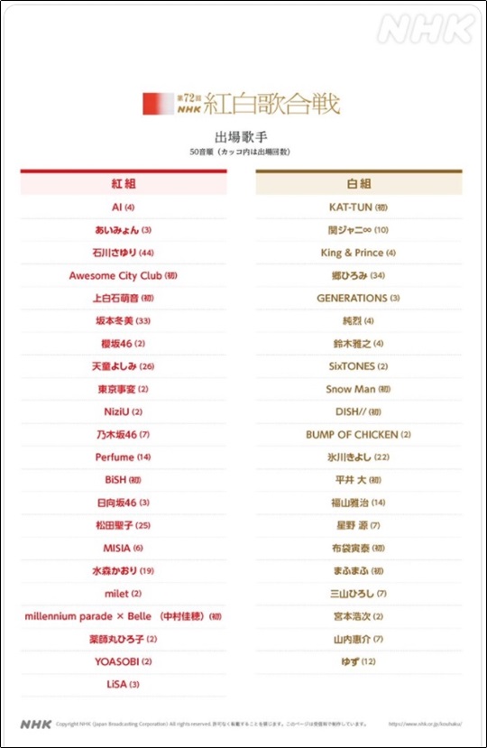 제72회 NHK 홍백가합전 출연자 명단 공개