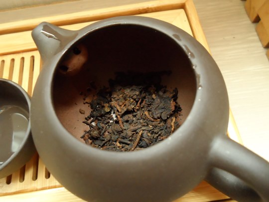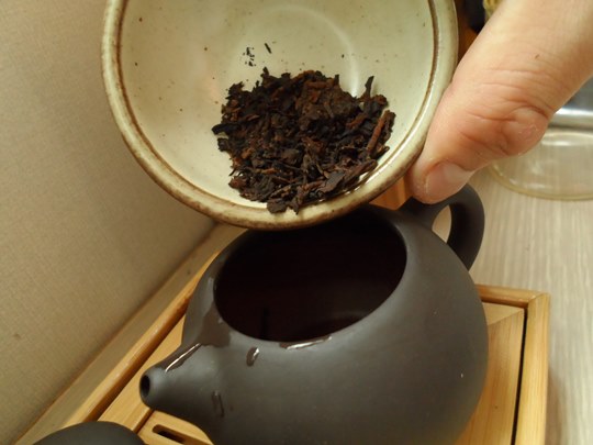예열된 자사호에 보이차를 넣어줍니다.