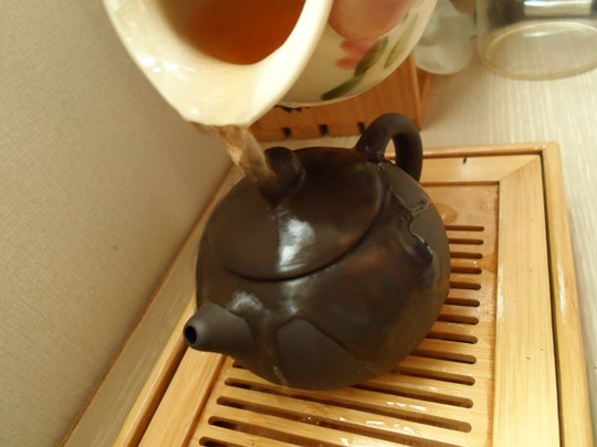 보이차가 든 자사호에 부어줍니다.