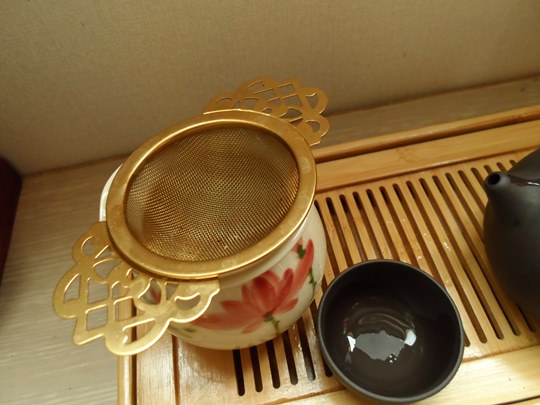 이제 숙우에 찻잎을 걸러줄 스트레이너를 올리고,