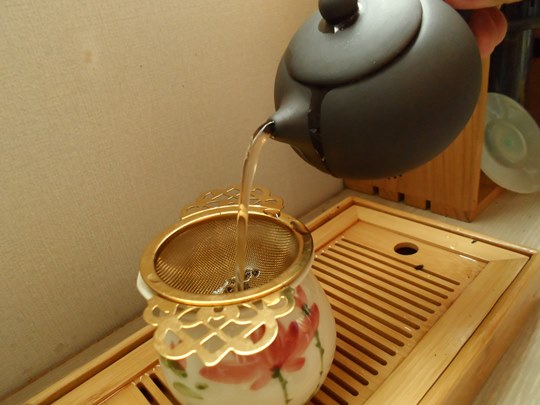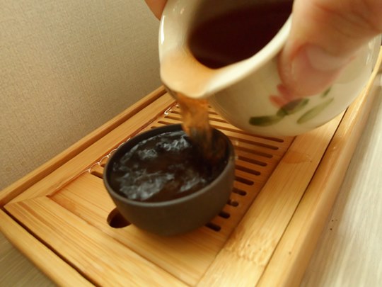 잠시 후, 우러난 보이차를 숙우에 부어 줍니다.