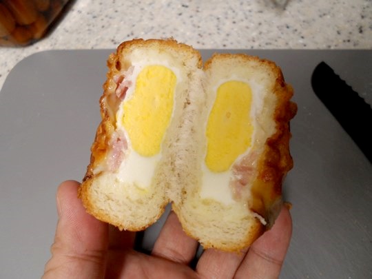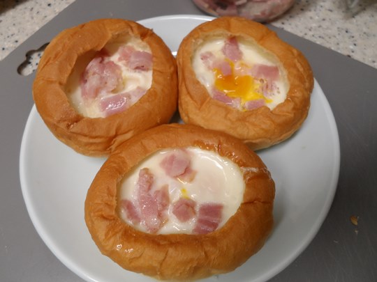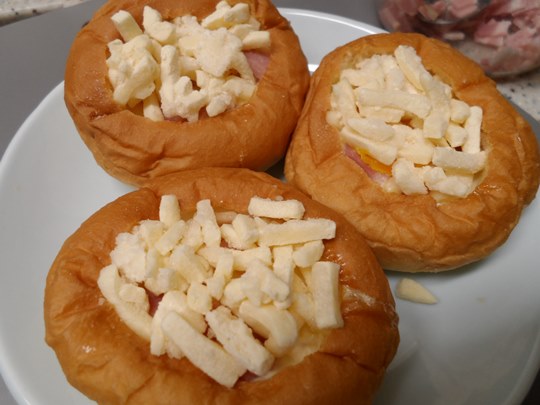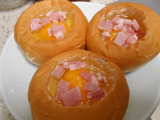 파낸 모닝롤에 날계란을 하나씩 넣어주는데요.