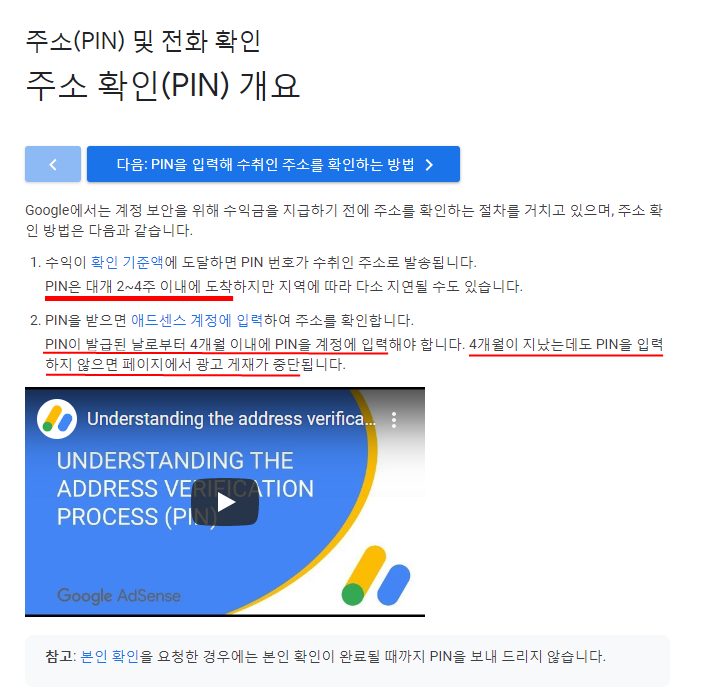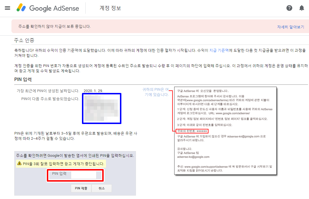주소를 확인하지 않아 지급이 보류중입니다. 드디어 애드센스 PIN 번호 발급되다.