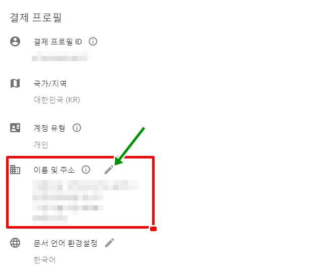 여기에 이름 및 주소 부분을 녹색화살표가 가리키는