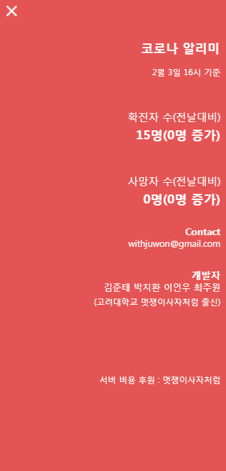 아래는 PC로 접속한 화면에서 본 코로나 알리미입니다.