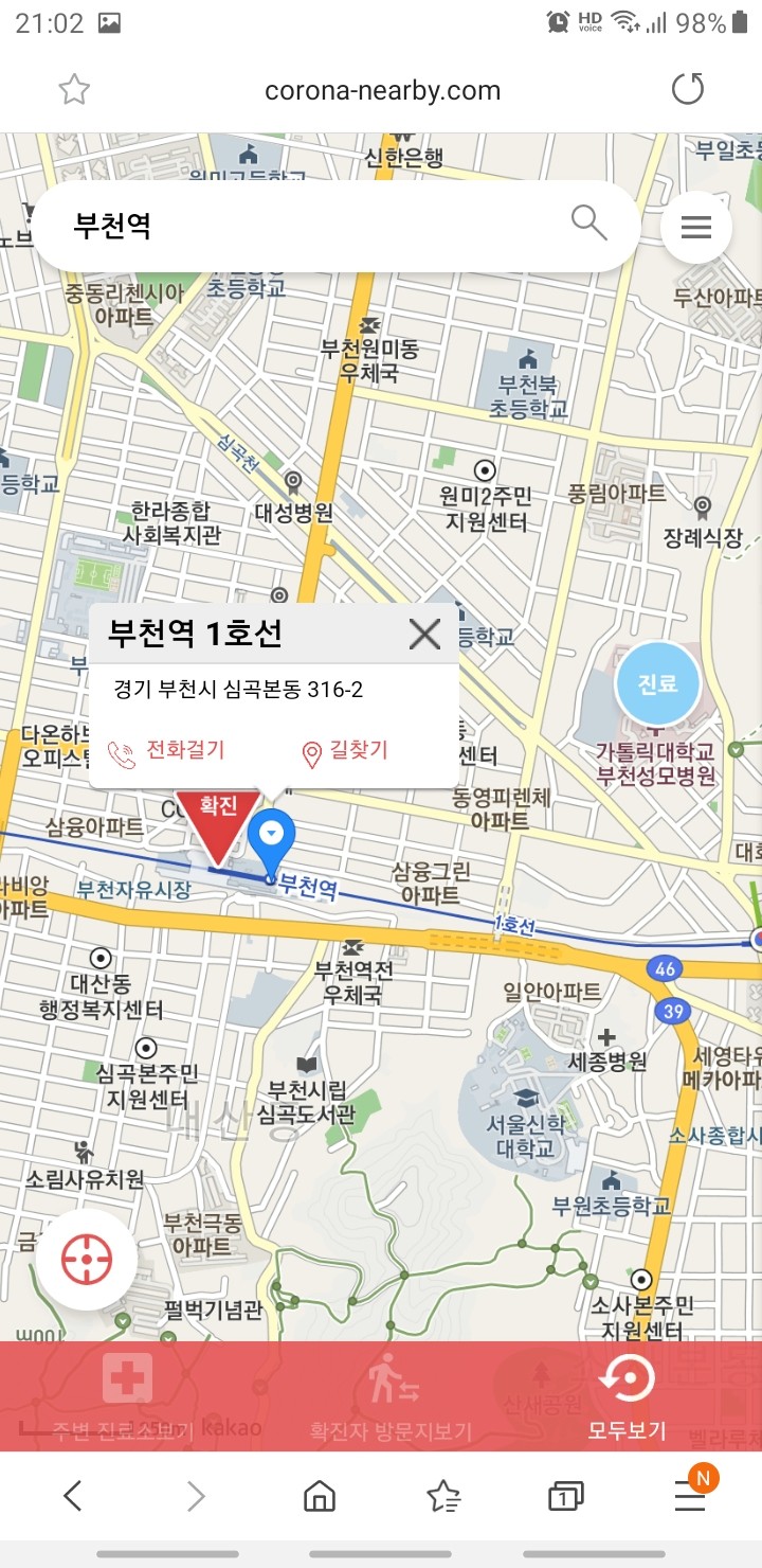 내 위치를 기준으로 주변 확진자들이 방문한 장소와 진료소를 볼 수 있습니다.