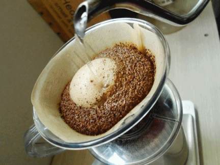 원두 가운데부터 뜨거운 물을 붓기 시작하여