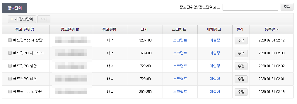 저는 광고단위를 아래 사진처럼 5가지로 만들었는데